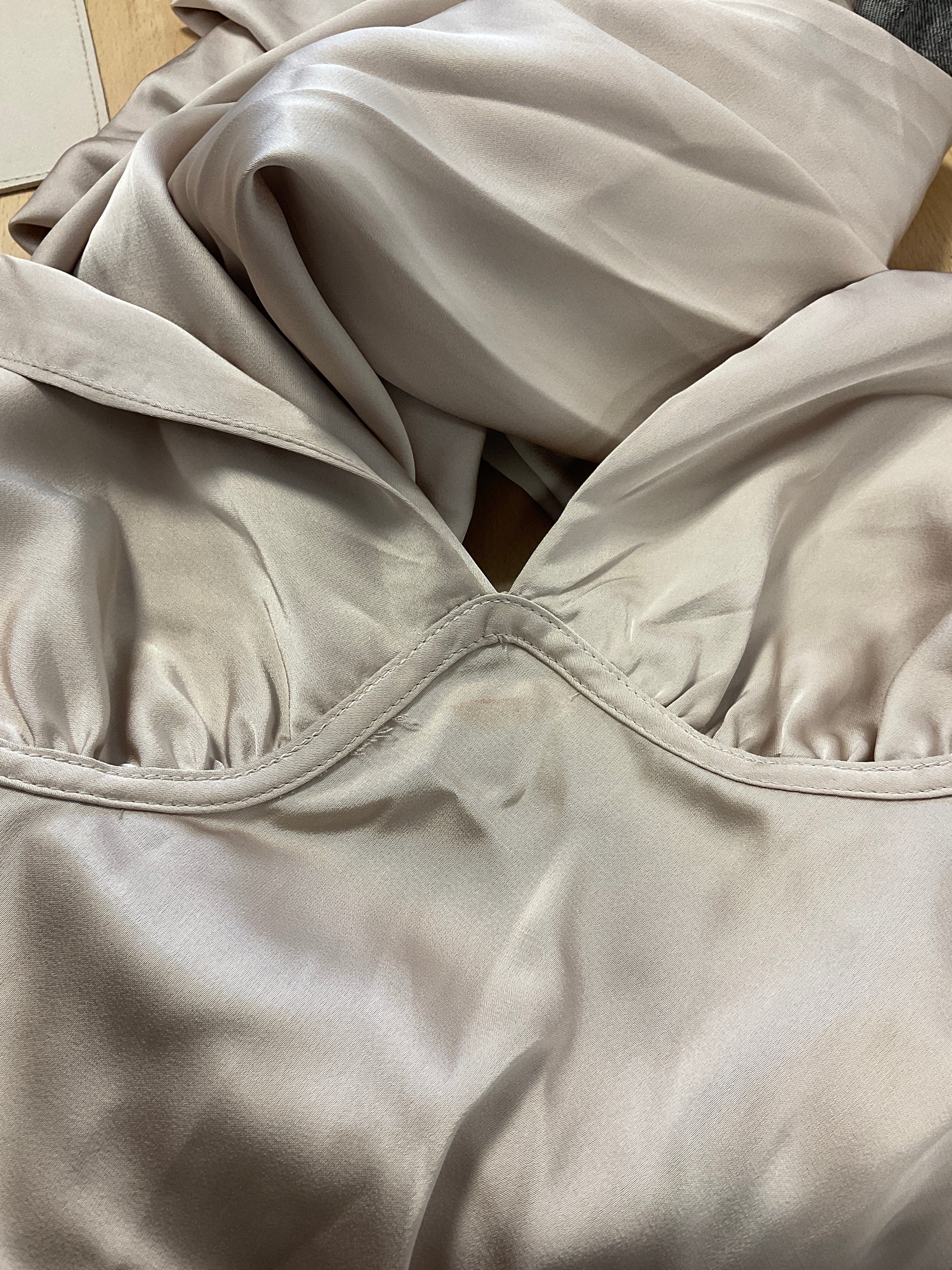Unvollkommene Verarbeitung, kleiner Fleck am Halsausschnitt.